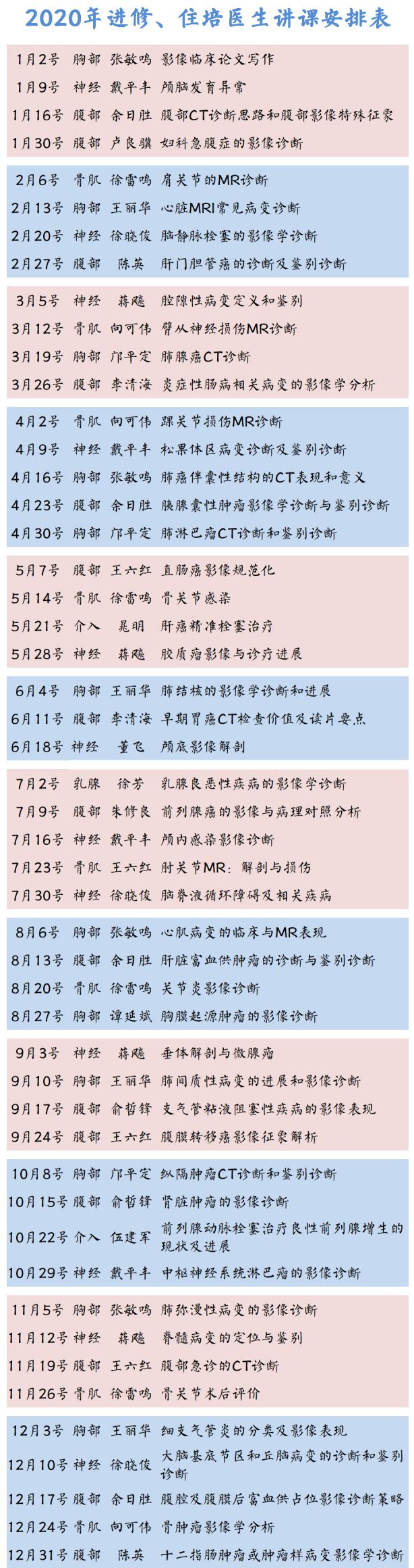 2020年现已到来,在此恭祝全省甚至全国的各位同路新年快乐!为了更好完结2020年进修生授课使命,我科各位专家在上一年授课内容基础上,结合进修生反应和工作重点,对下一年度课程和内容进行了调整。现将课程内容、时刻发布如下。