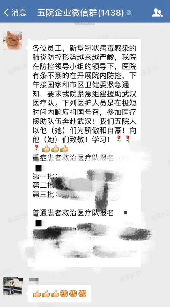 1月23日17点28分,复旦大学隶属上海市第五人民医院副院长洪洋在微信群里,向整体职工表明,“医护人员是在极短时间内呼应祖国召唤,参与医疗帮助部队奔赴武汉!咱们五院人以他(她)们为骄傲和骄傲!向他(她)们问候!学习!”