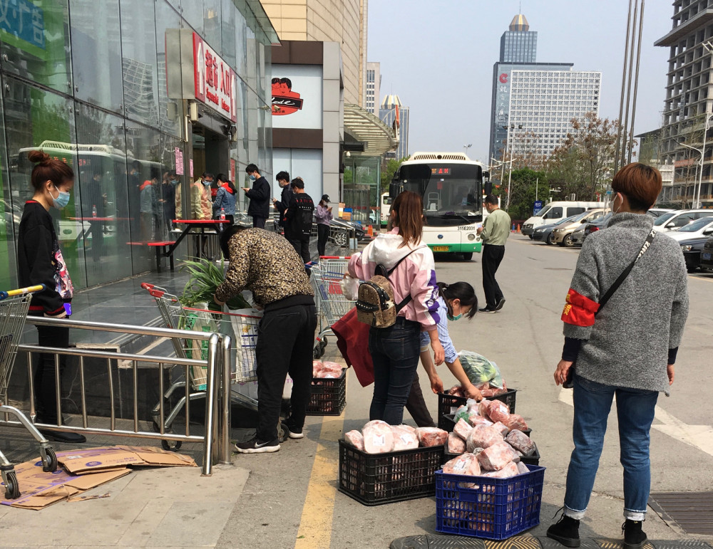 今日酒店近邻的超市开门了。有代表小区出来一致购物的,带回满满几箱肉类还有蔬菜,来的人只需扫过健康码就可以进去。一条漂泊狗在超市门口徜徉,门口的阿姨介绍说:“这条狗现已漂泊了两个月了,是仁慈的人给它不守时喂养,它才干活到今日。”