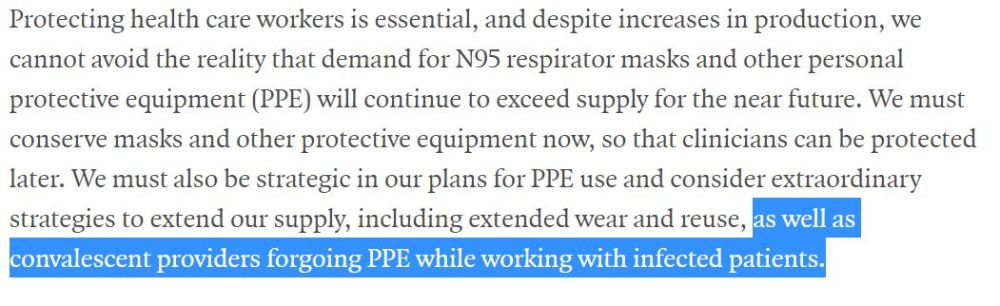 他们都以为,当前社会必须节约使用口罩和其他防护设备,还要在使用个人防护设备时制定计划,考虑采取延长使用时间、重复使用、以及让处于新冠肺炎康复期的医护人员工作时直接放弃个人防护设备等特别策略。