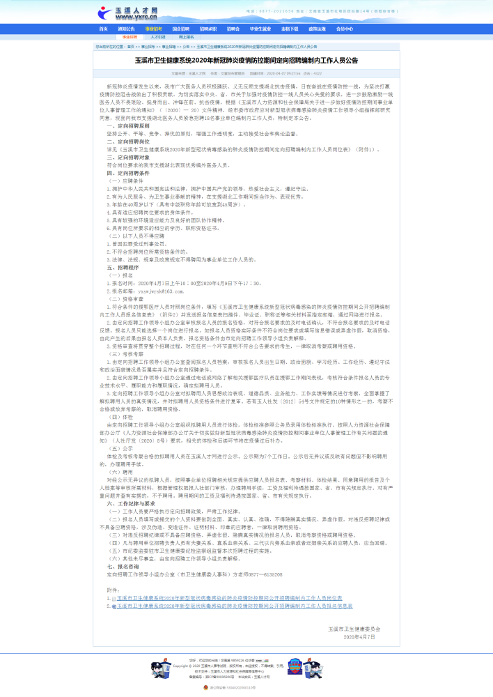 玉溪人才网4月7日发布《玉溪市卫生健康体系2020年新冠肺炎疫情防控期间定向招聘编制内工作人员布告》,定向招聘此次云南玉溪市援助湖北体现优异的编外医护人员,查核调查合格后即可直接招聘聘任。