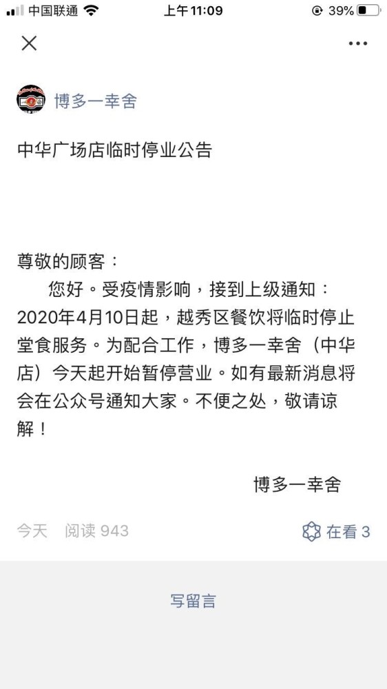 今天,博多一幸舍中华广场店发布暂时歇业布告,因疫情影响,接到告诉自4月10日越秀区餐饮将暂时中止堂食服务。
