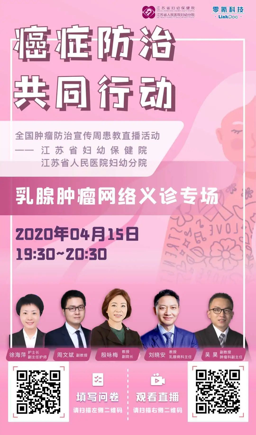 在本年的肿瘤宣扬周中,由国家肿瘤质控中心乳腺癌专家委员会专家——江苏省公民医院唐金海教授,王水教授、殷咏梅教授以及江苏省公民医院MDT团队以及其他家医院团队一起参加了乳腺癌多学科标准医治才能建造项目云讲堂等公益活动,一起讨论共享乳腺疾病医治标准、质量检测与操控、多学科医治才能建造等经历;此外殷咏梅教授还受邀参加了由公民日报、健康时报、公民名医、腾讯新闻等媒体一起主办的尖端肿瘤专家义诊专场系列直播活动,为广阔患友进行有关乳腺癌的医治方面的科普解说。